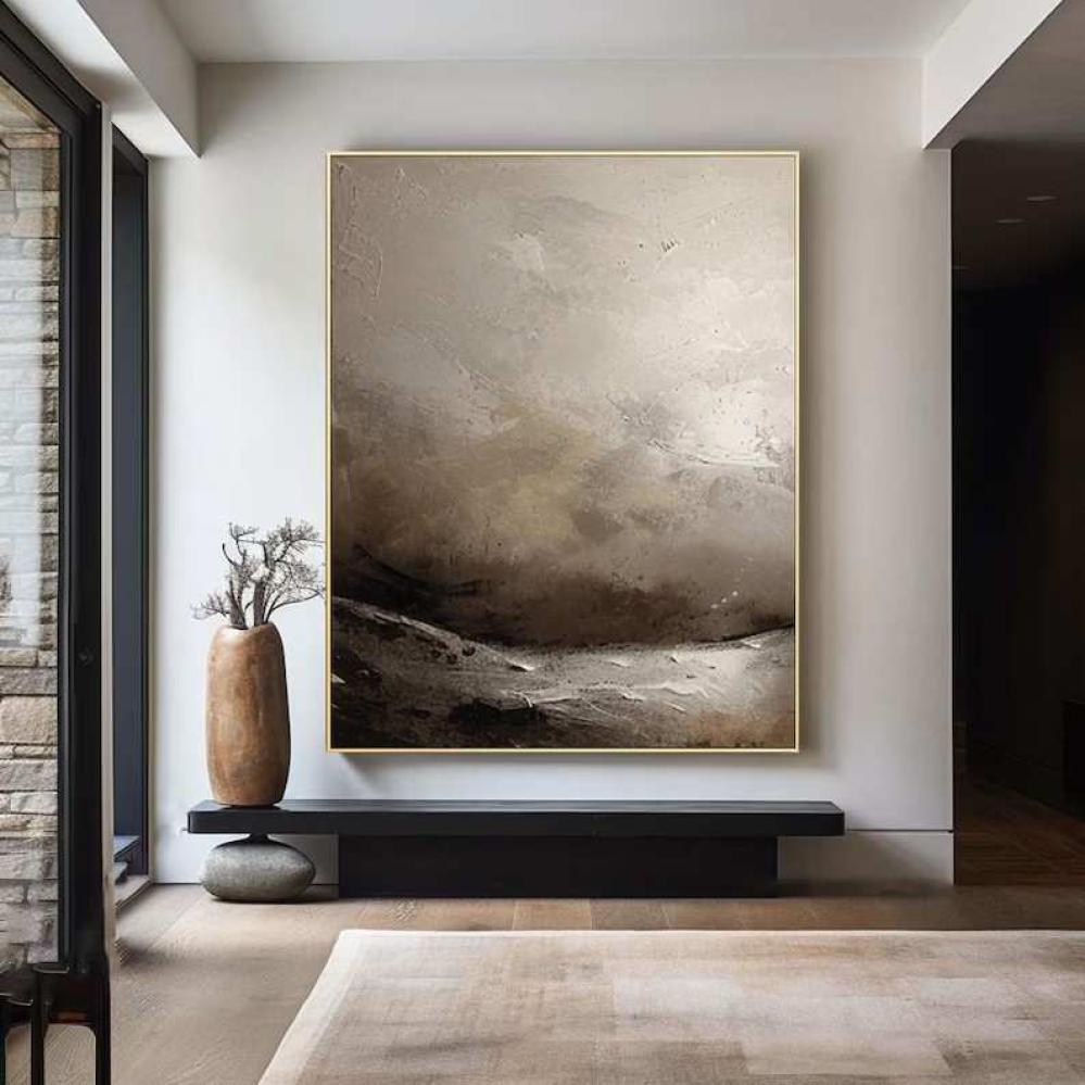 لوحة فنية بأسلوب تجريدي تحاكي مشهدًا طبيعيًا ضبابيًا وكأنها جبال تُغطيها سحابة رمادية هادئة. تمتاز بتدرجات بين البيج، الرمادي، والأسود، وتناسب جميع المساحات مثل الممرات، غرف الجلوس، أو حتى المكاتب.