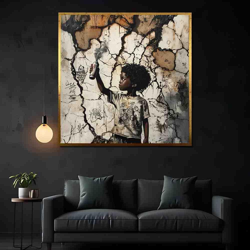 لوحة تجسد مشهد طفولي بريء وسط جدار متشقق وكأن الطفل يرسم مستقبله بيده، رغم قسوة العالم من حوله. تصميمها يمزج بين فن الشارع والجرافيتي وبين الرمزية الإنسانية، وتناسب بشكل رائع المساحات اللي تبغى تعكس عمق وإحساس بالفن والثقافة. مثالية لغرف المعيشة أو الزوايا الفنية أو حتى مكاتب الإبداع والتصميم.