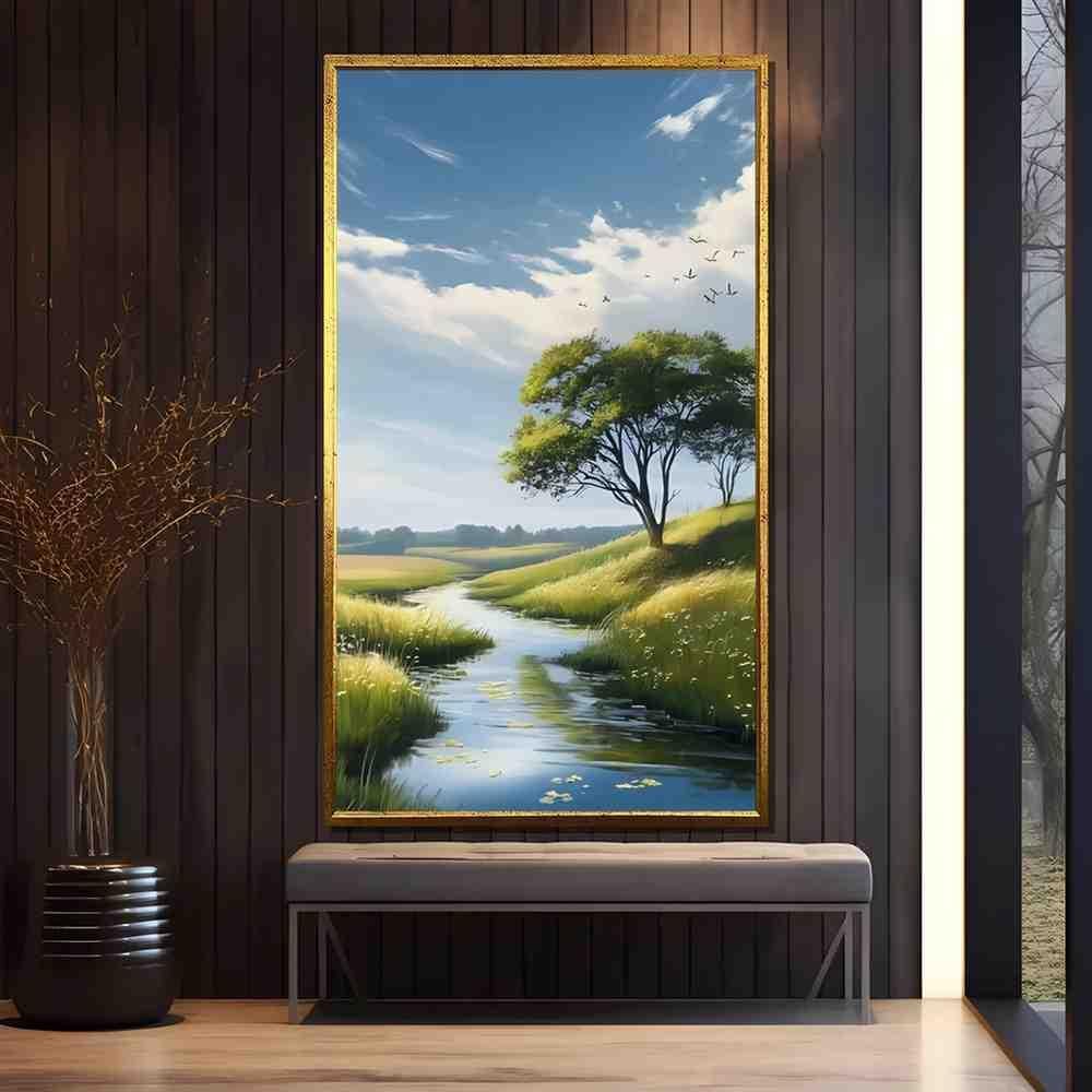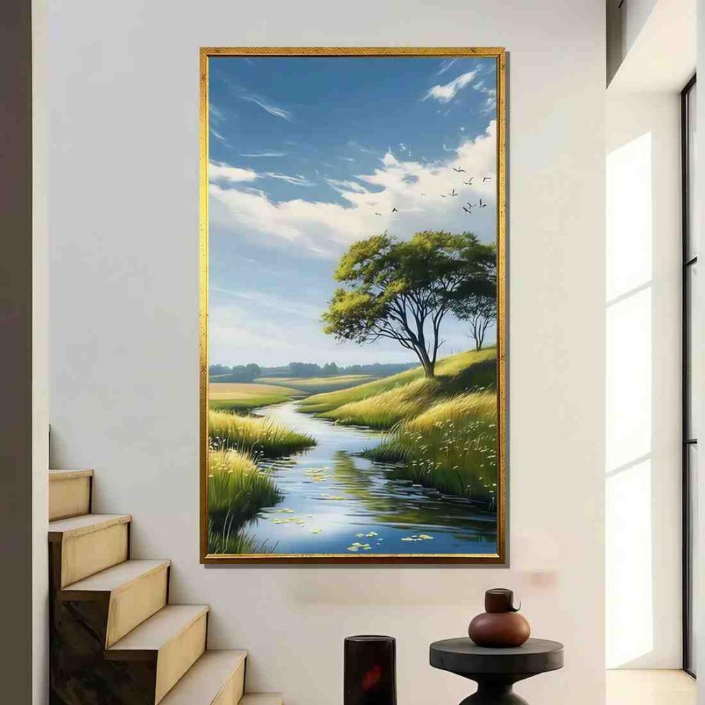 هاللوحة تعكس جمال الطبيعة بأبسط تفاصيلها: جدول مائي هادي، أعشاب خضرا تميل مع النسيم، وسما زرقا فيها نسمات سلام. تعطيك إحساس بالانتعاش والسكينة، وتضيف لمسة حياة لأي ممر أو مدخل في بيتك.