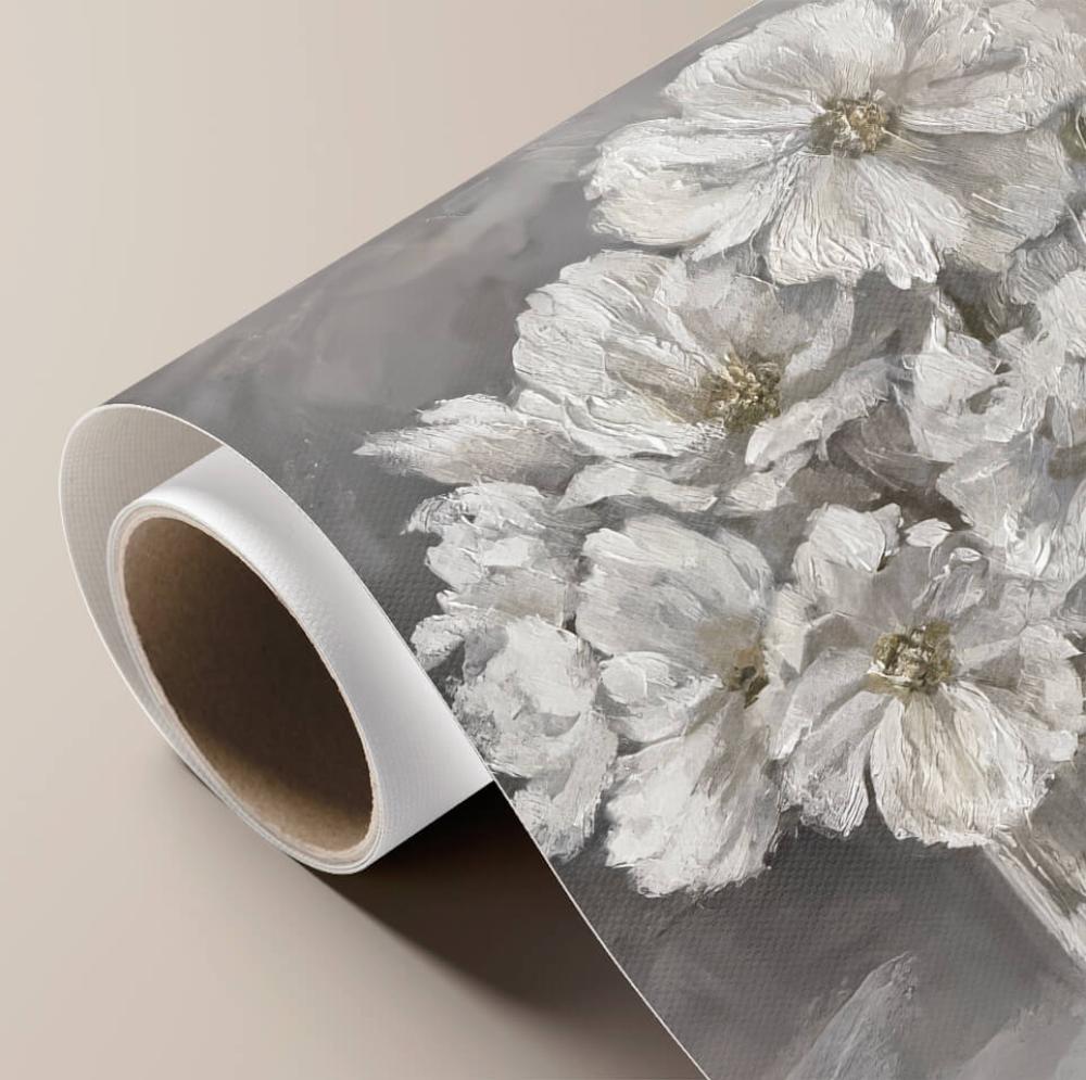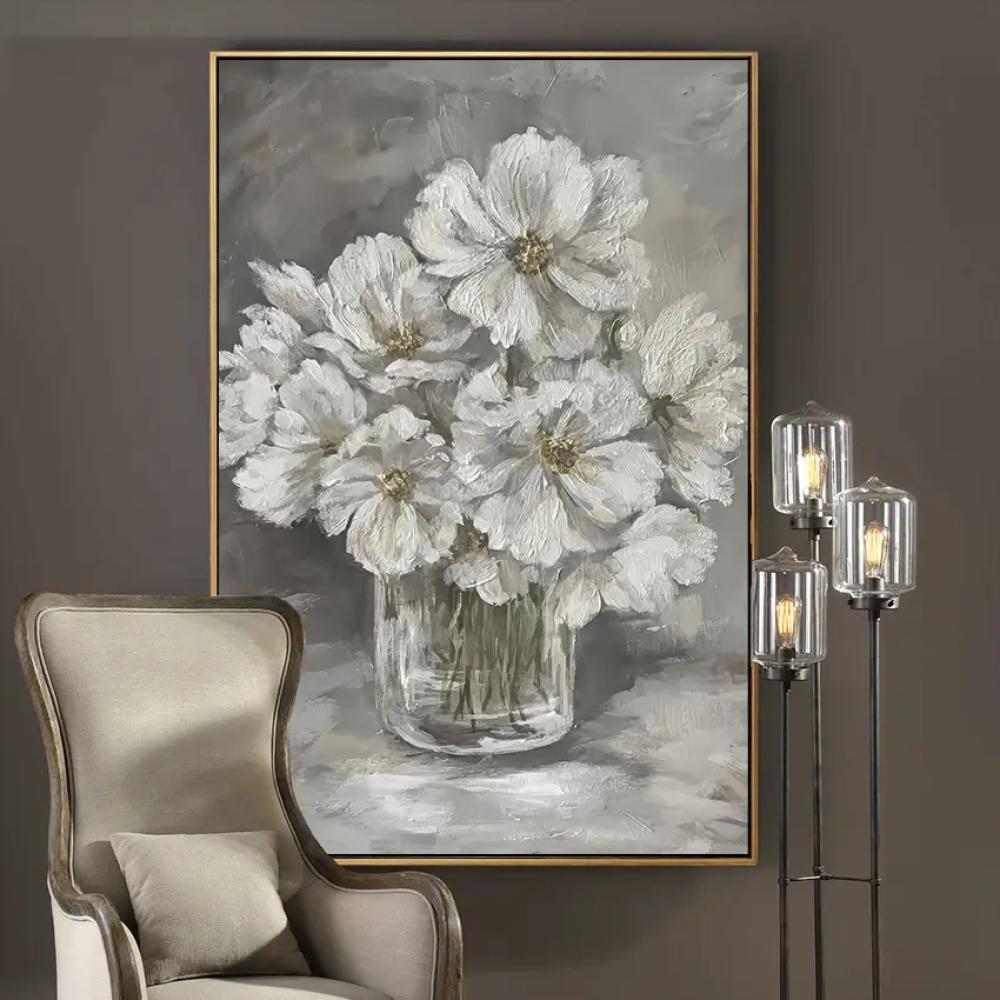 لوحة ثلاثية الأبعاد كانفس لتنسيق زهور بيضاء ناعمة داخل مزهرية زجاجية، والخلفية الرمادية تضيف لها لمسة هادية وكلاسيكية ✨