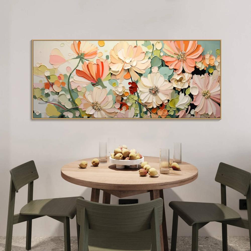 الطباعة على قماش كانفس بجودة عالية تبرز تفاصيل الزهور الكريمية والمشمشية بشكل ثلاثي واضح، ممتدة على خلفية فاتحة توحي بالراحة والنعومة.