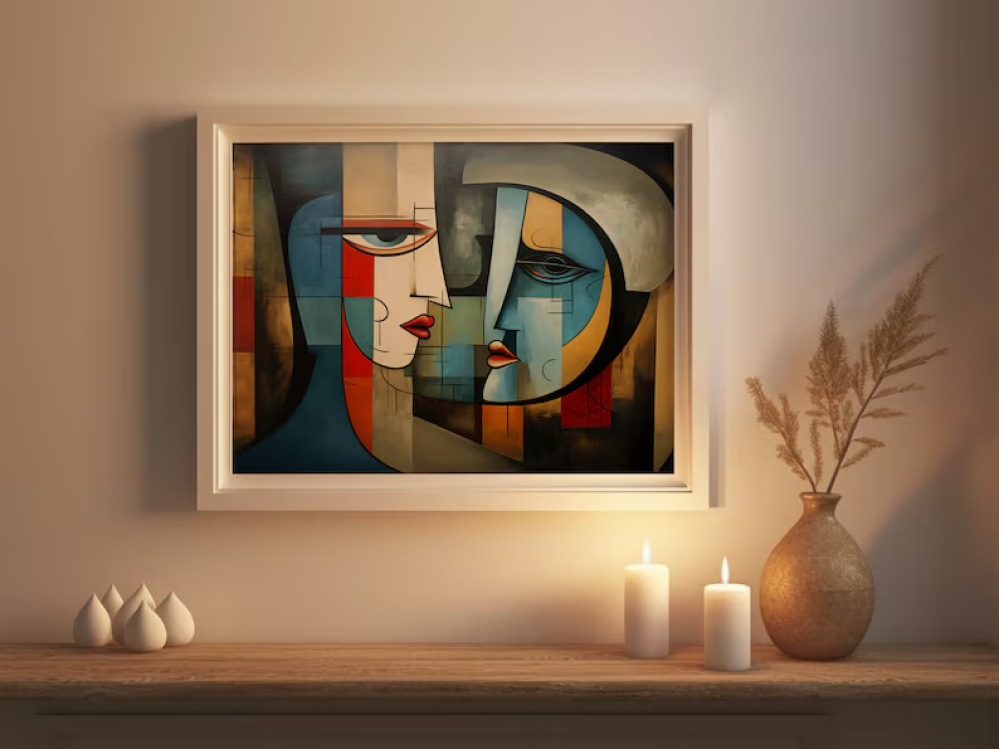 لوحة كانفس تكعيبية لوجوه متقابلة – تصميم هادئ وأنيق بإطار أبيض عرضي