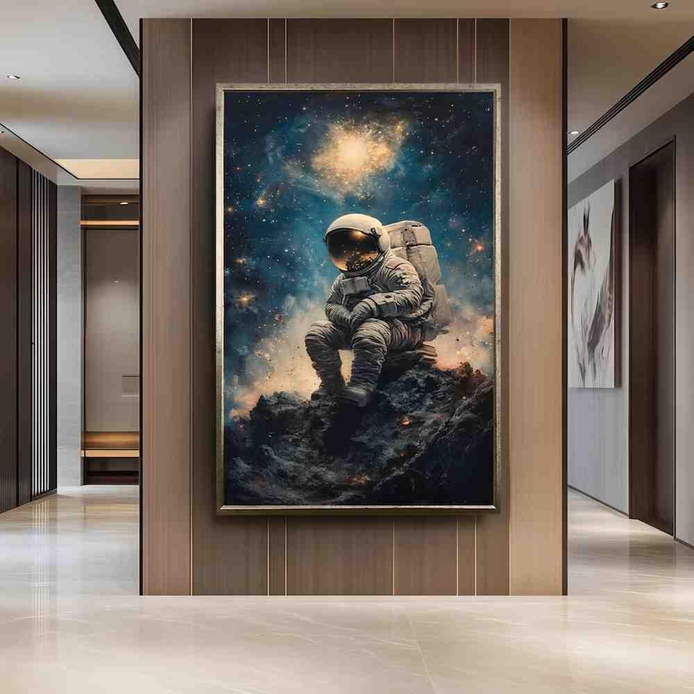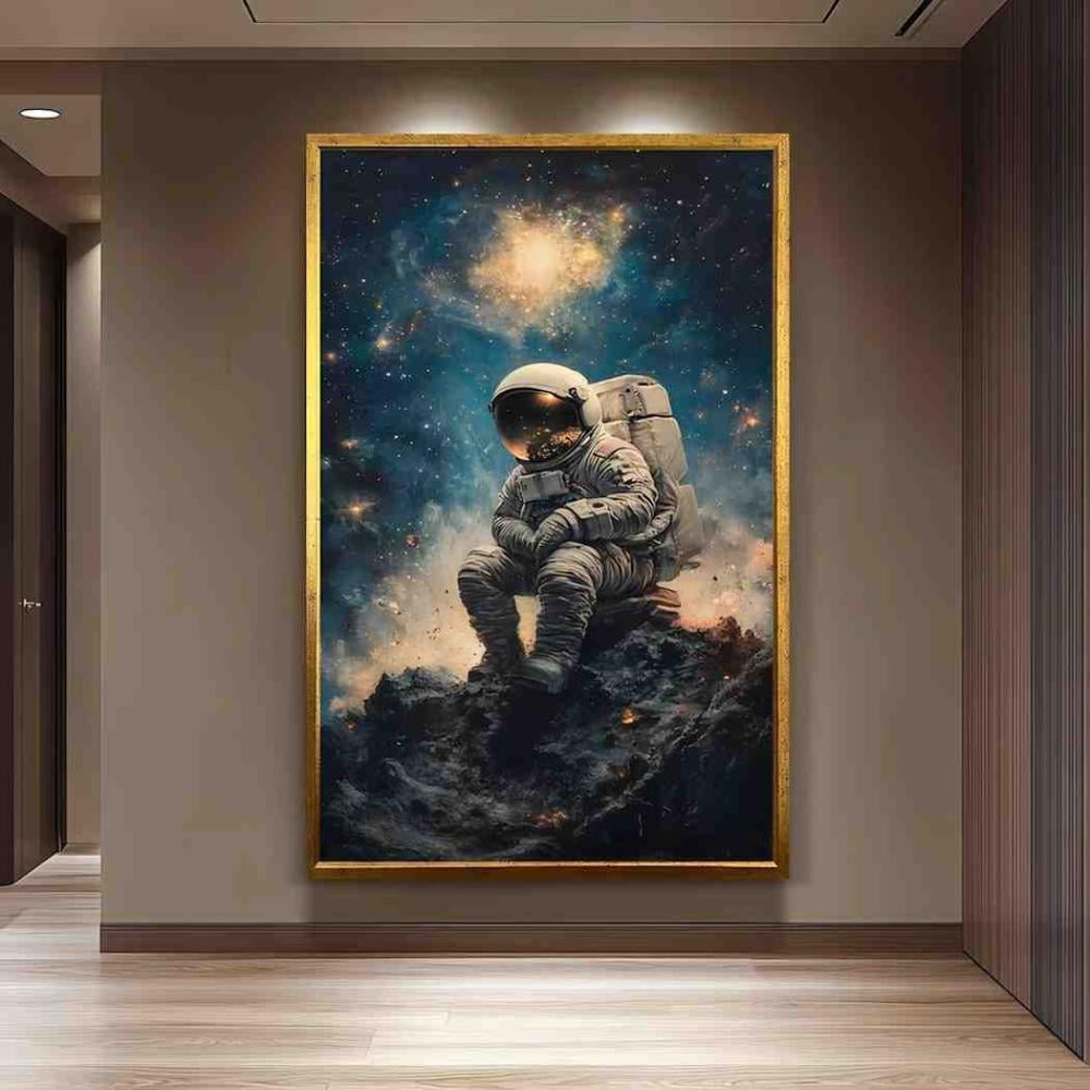 لوحتنا الفنية الفريدة تعرض رائد فضاء جالس وكأنه يتأمل الكون من مكان بعيد، بألوان داكنة رائعة ولمسة ذهبية للإطار تضيف فخامة للمكان ✨