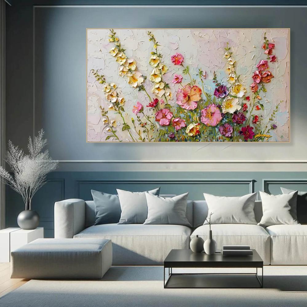 لوحة كانفس أنيقة بثيم الأزهار الناعمة بتدرجات الوردي والأصفر، بتقنية ثلاثية الأبعاد تضيف عمقًا بصريًا وسحرًا خاصًا لأي غرفة 🛋️🌼. مثالية لغرف المعيشة الراقية أو المساحات الهادئة التي تحتاج لمسة أنثوية ناعمة وإحساس بالطبيعة ✨🌿.