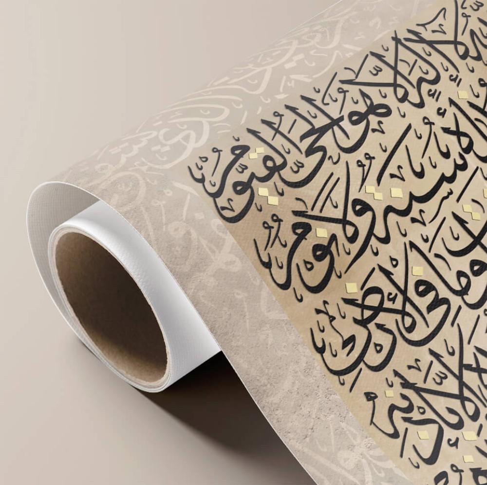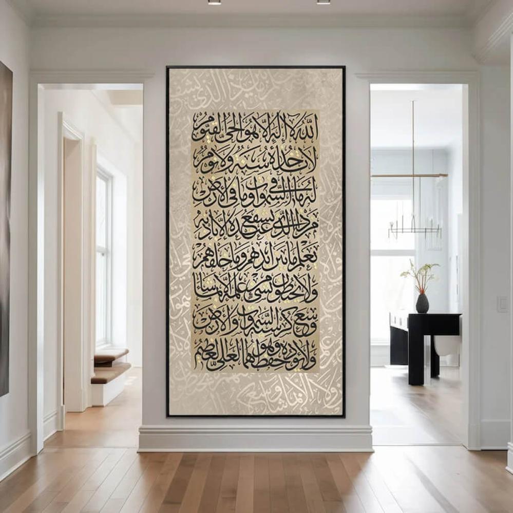 لوحات فنية ثلاثية الابعاد تعرض آية الكرسي مكتوبة بخط عربي طولي أنيق على كانفس بخلفية بيج مزخرفة وهادئة. تضيف هذه اللوحة جوًا من البركة والحماية والطمأنينة لأي مكان، وتناسب المداخل، المجالس، غرف النوم، أو زوايا الصلاة، لتكون قطعة فنية تجمع بين الجمال الروحاني والفخامة الإسلامية في آن واحد.
