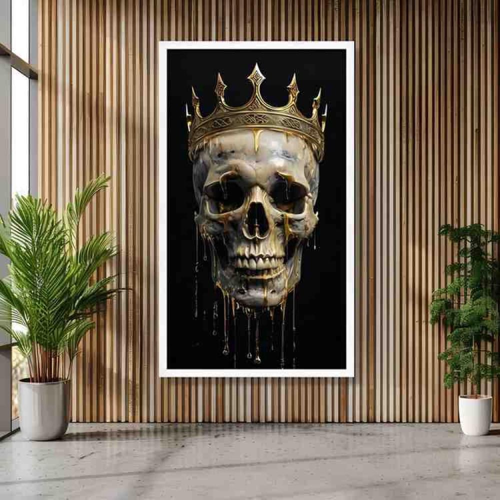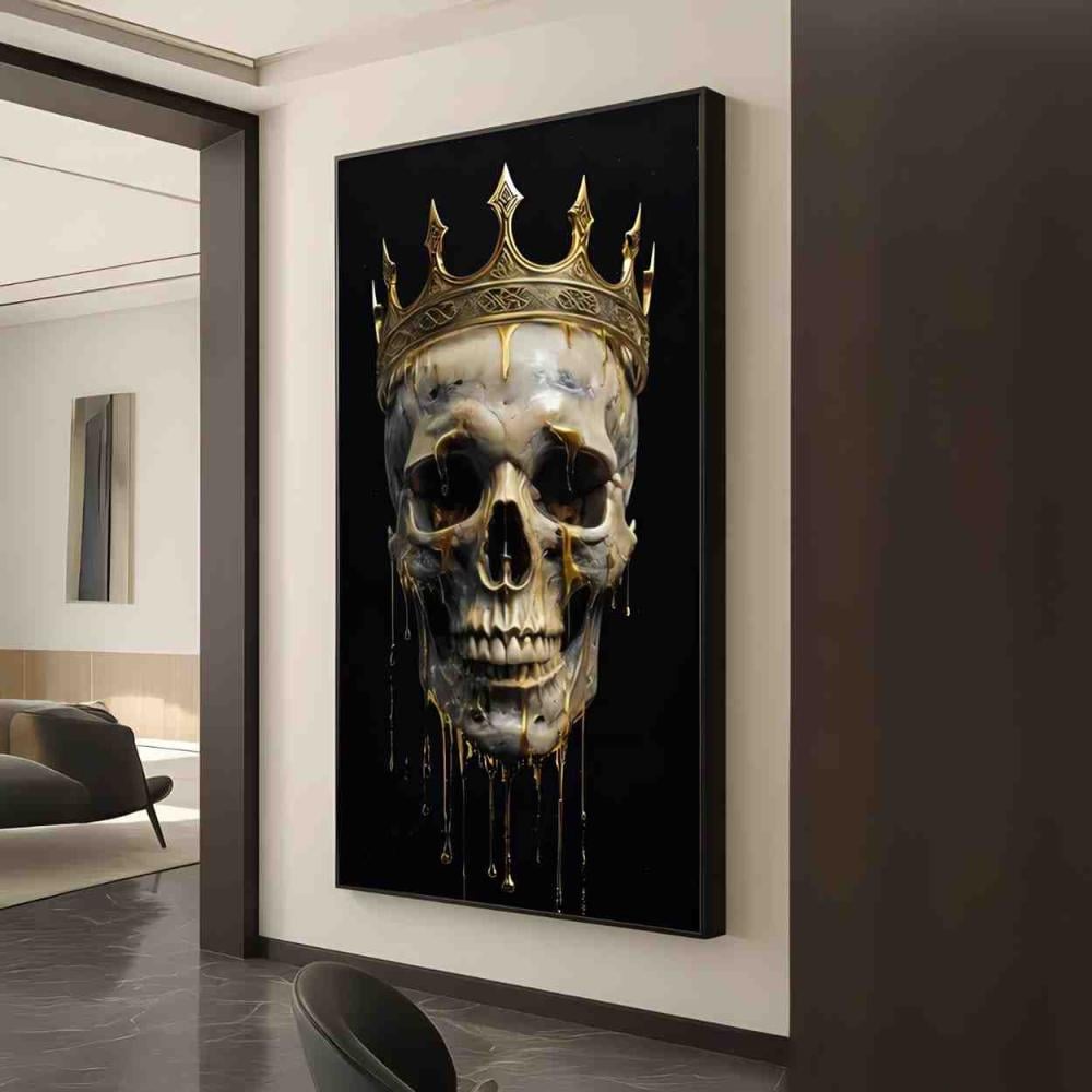 لوحة فنية تجمع بين الهيبة والرعب بأسلوب فني راقي. التصميم يعرض جمجمة واقعية مرتدية تاج ذهبي تنساب منه قطرات الذهب وكأنها تذوب، تعبر عن قوة الحياة والموت بأسلوب فاخر. مثالية لعشاق الفن الجريء والتصاميم المعاصرة، وتناسب الصالات والمكاتب والركن الفني.