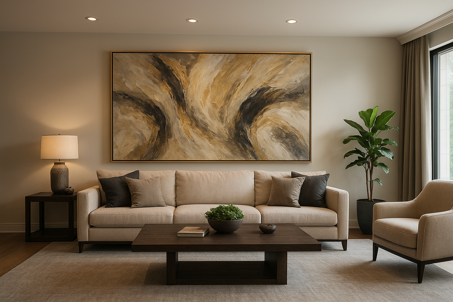 - الصالات الفخمة تناسبها لوحة ضخمة جدًا (مثال ٢٥٠*١٥٠ سم).