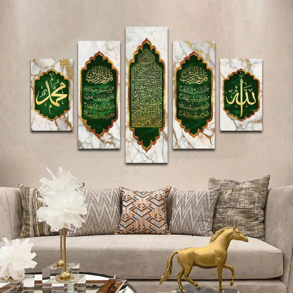 لوحة جدارية دينية من خمس قطع متكاملة بتصميم أنيق يجمع بين اللون الأخضر الملكي والذهبي الفاخر 🌟، تتزين بآيات قرآنية مكتوبة بخط عربي راقٍ 🕋. تضفي هذه اللوحة لمسة فخمة ومريحة في المجالس أو صالة الجلوس أو الزوايا الهادئة ✨🛋️.