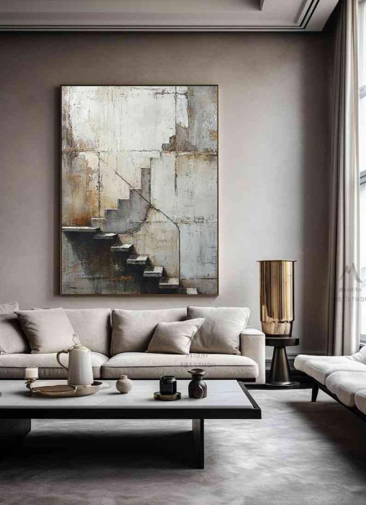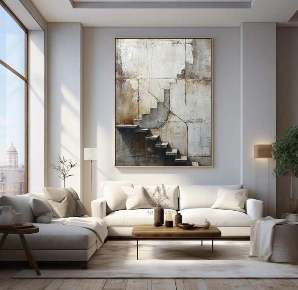 لوحة تجريدية واقعية بأسلوب فن حضري صناعي تظهر درج خرساني قديم على خلفية جدار متآكل بألوان الأبيض والرمادي ولمسات صدأ، تعطي إحساس بالعراقة والعمق، وتناسب المساحات ذات الطابع العصري أو اللوفت الصناعي.