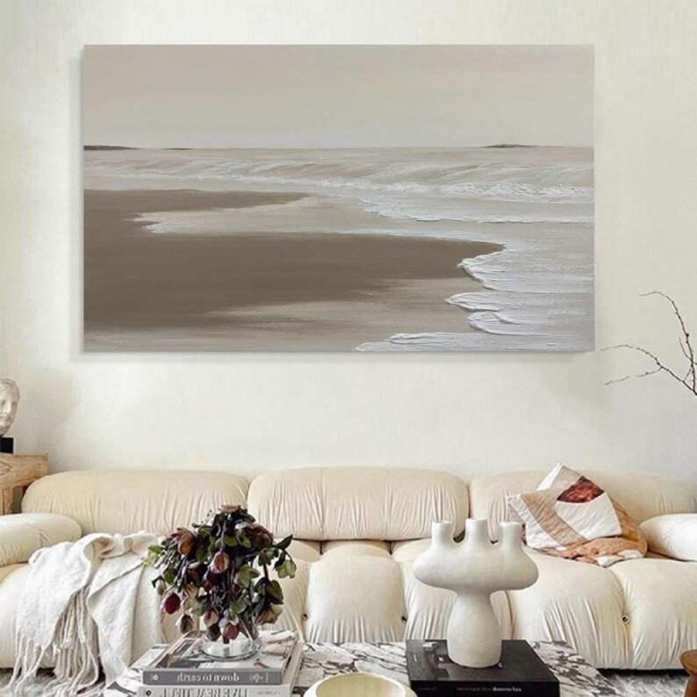 لوحة فنية مميزة برسمة شاطئ هادئ ولموج البحر بلون بيج ناعم، تعطي إحساس بالسكينة والهدوء في المكان. مثالية لعشاق المناظر الطبيعية اللي يحبون يضيفون لمسة ناعمة لديكور البيت.