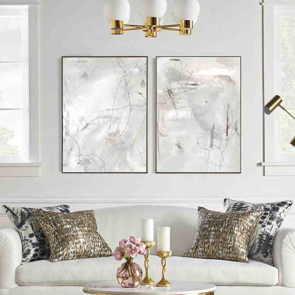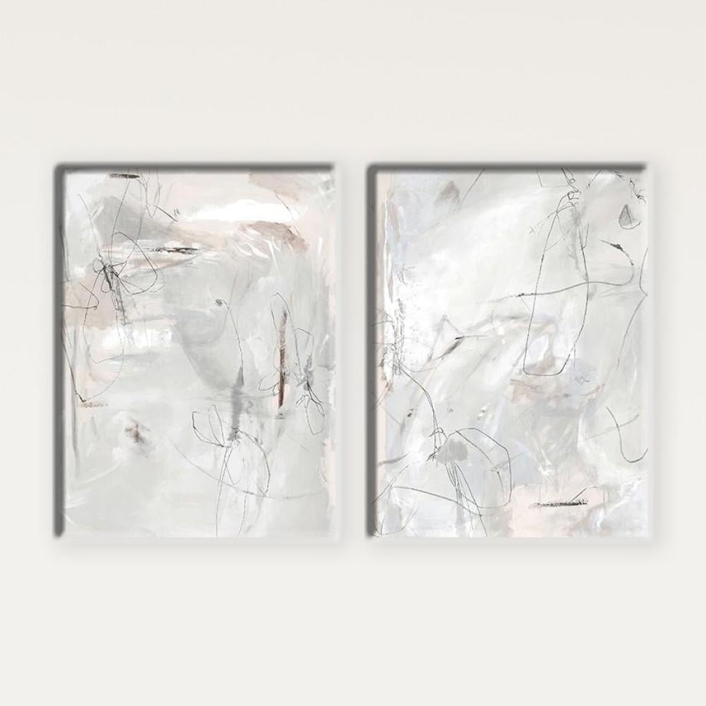 لوحتين تجريدية فخمة بألوان بيضاء ودرجات الرمادي مع خطوط رفيعة تعطي لمسة أنيقة وفنية في المكان. شكلها جداً راقي وتناسب غرف المعيشة، المكاتب أو أي ركن مودرن. الدمج بين البساطة والتفاصيل يخليها تبان غالية وتلفت النظر بدون زحمة في التصميم 💫.