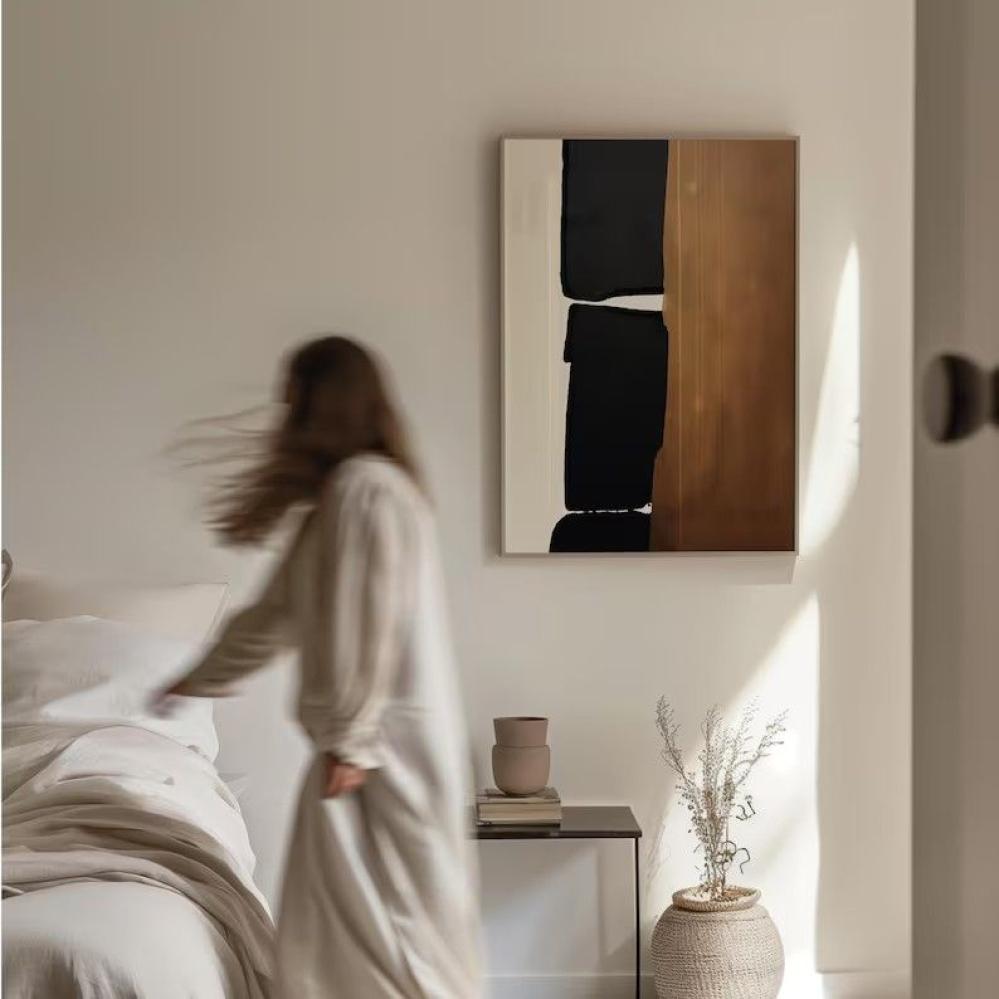 لوحة فنية تجريدية عصرية، تتميز بأشكال مستطيلة باللون الأسود تتقاطع مع مساحة عريضة بلون جملي دافئ على خلفية بيضاء. مثالية لعشاق البساطة الجريئة، وتضيف لمسة معمارية راقية للمجالس وغرف المعيشة العصرية.