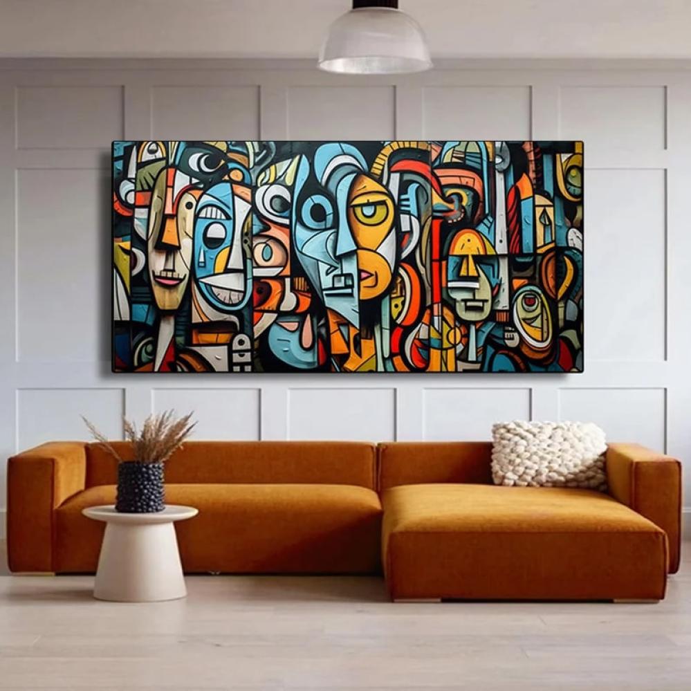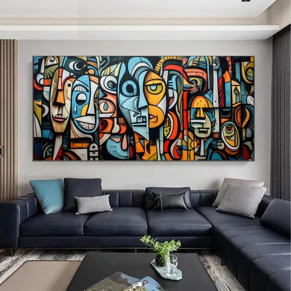 لوحة كانفس بانورامية ضخمة بأسلوب تكعيبي فني جريء، تحتوي على مجموعة وجوه وشخصيات هندسية متداخلة ضمن تكوين بصري غني بالتفاصيل. الألوان المتنوعة مثل الأزرق، البرتقالي، الأحمر، والأصفر تضيف عمقًا وتنوعًا يجعل اللوحة قطعة محورية لأي مساحة معاصرة.